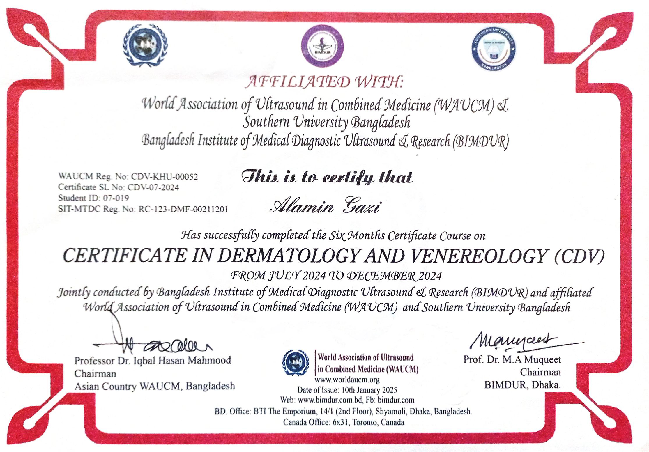Alamin Gazi April 20, 2026 admin WAUCM Reg. No: CDV-KHU-00052 Certificate SL No: CDV-07-2024 Student ID: 07-019 SIT-MTDC Reg. No: RC-123-DMF-00211201